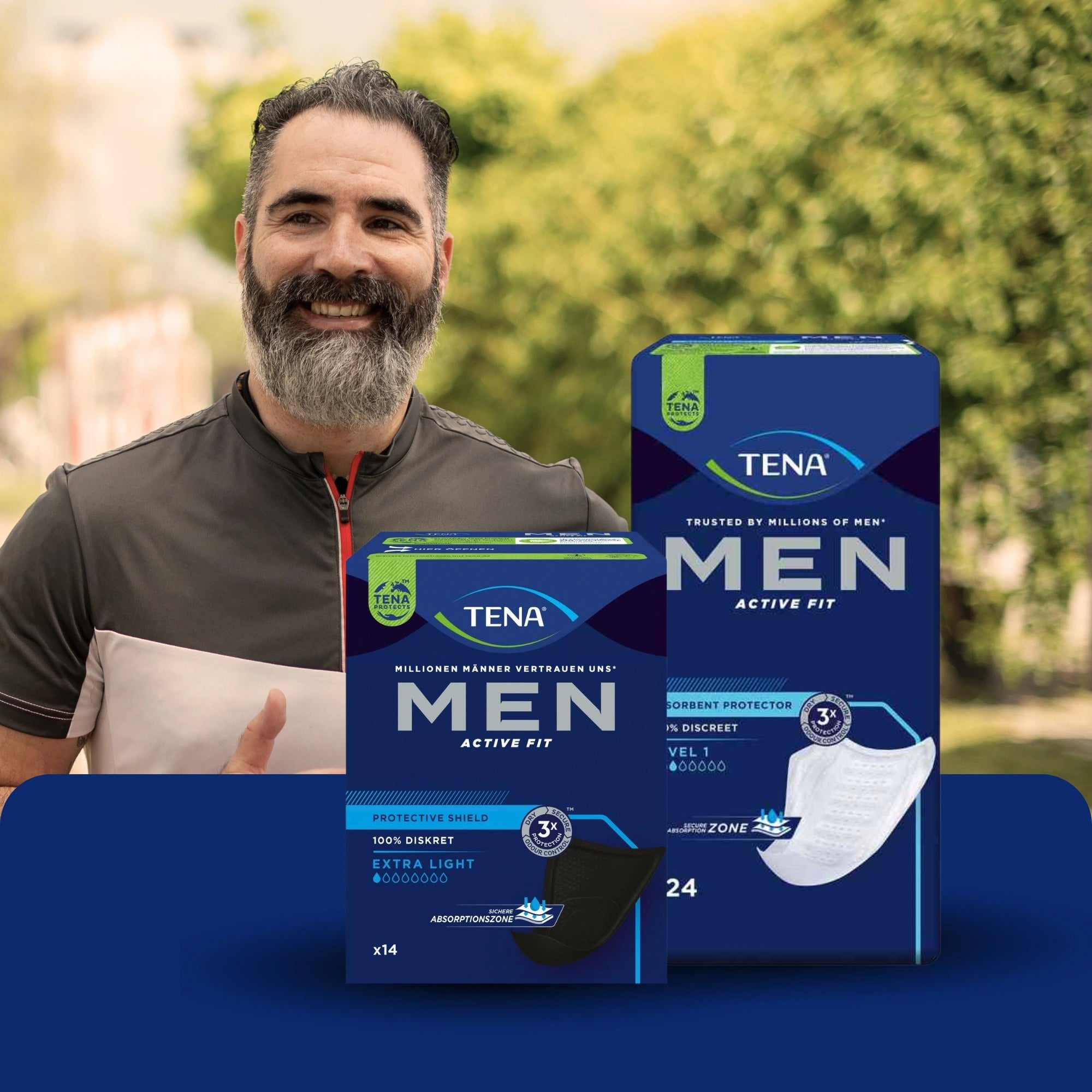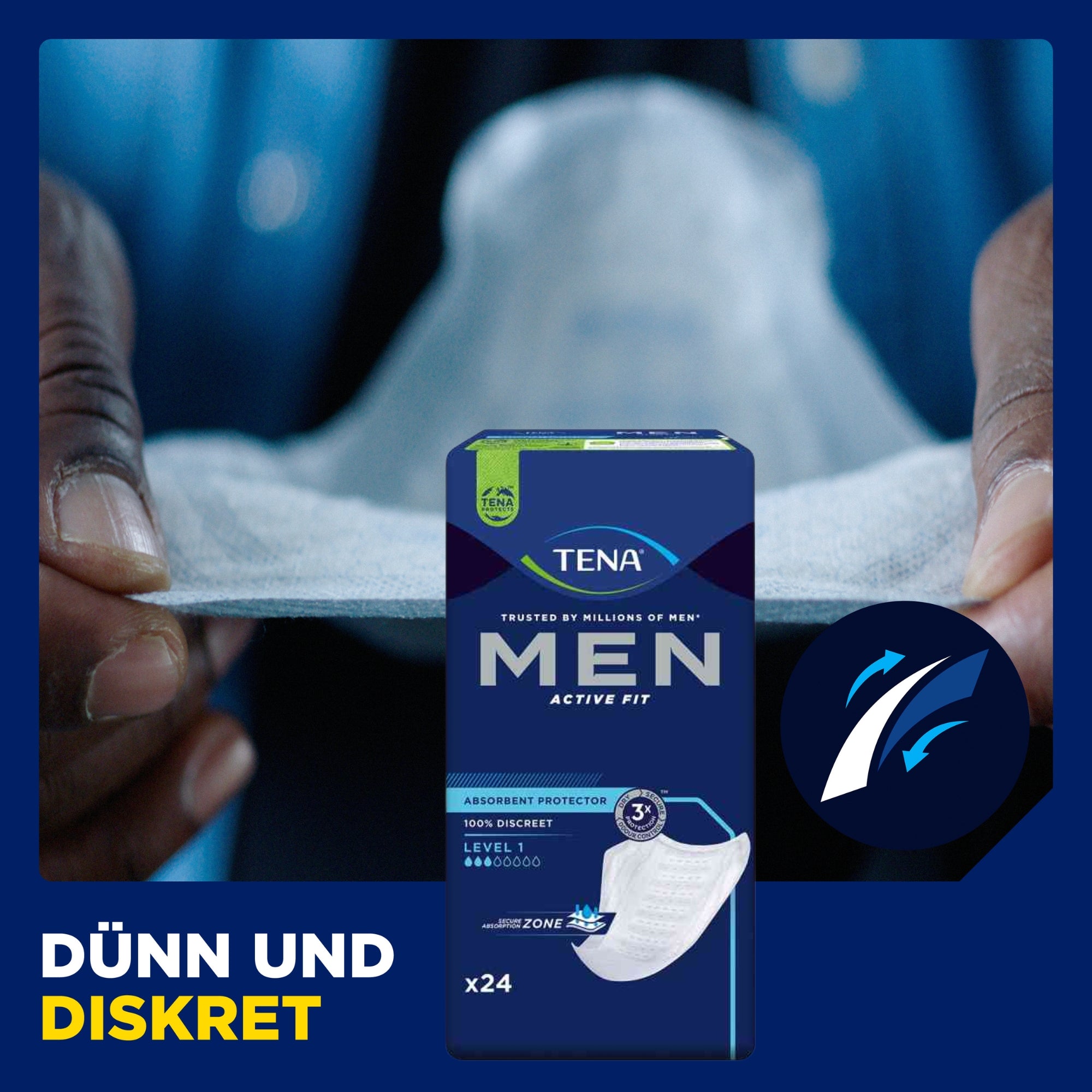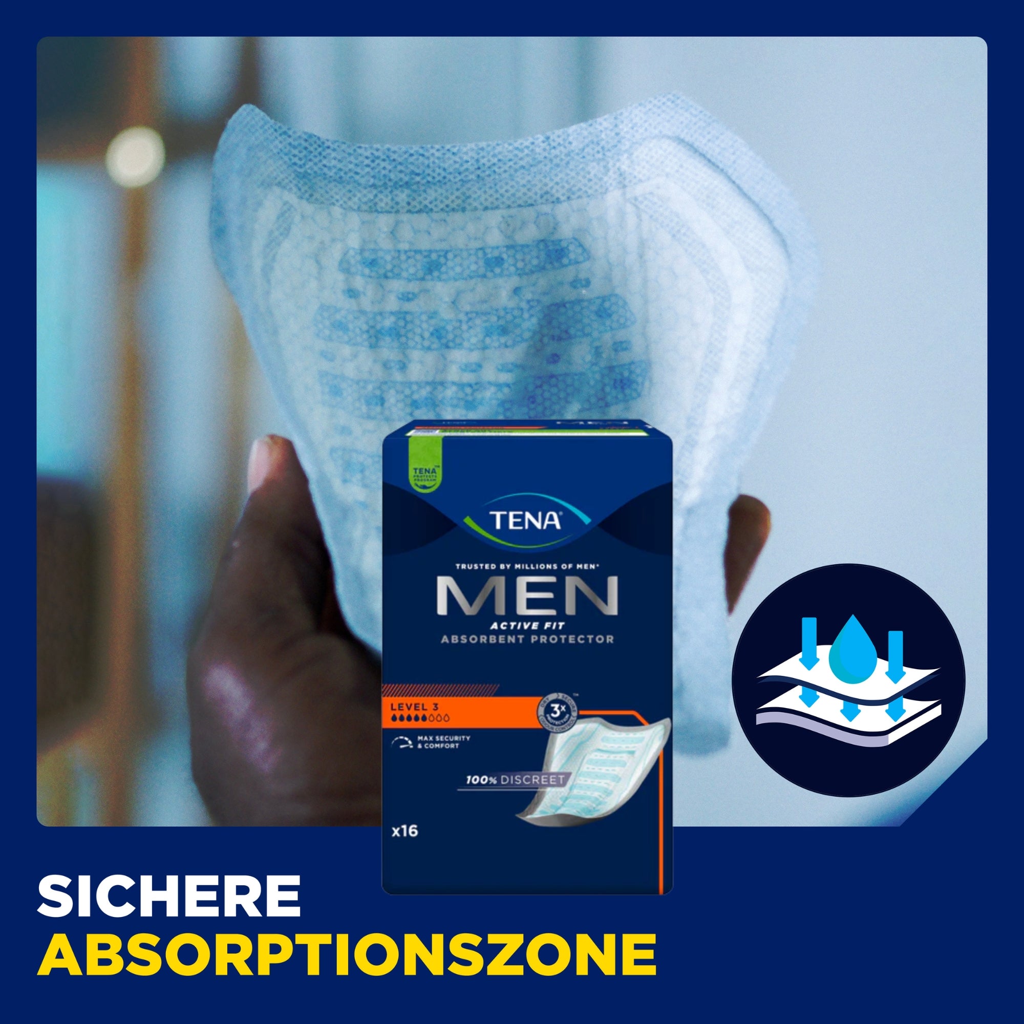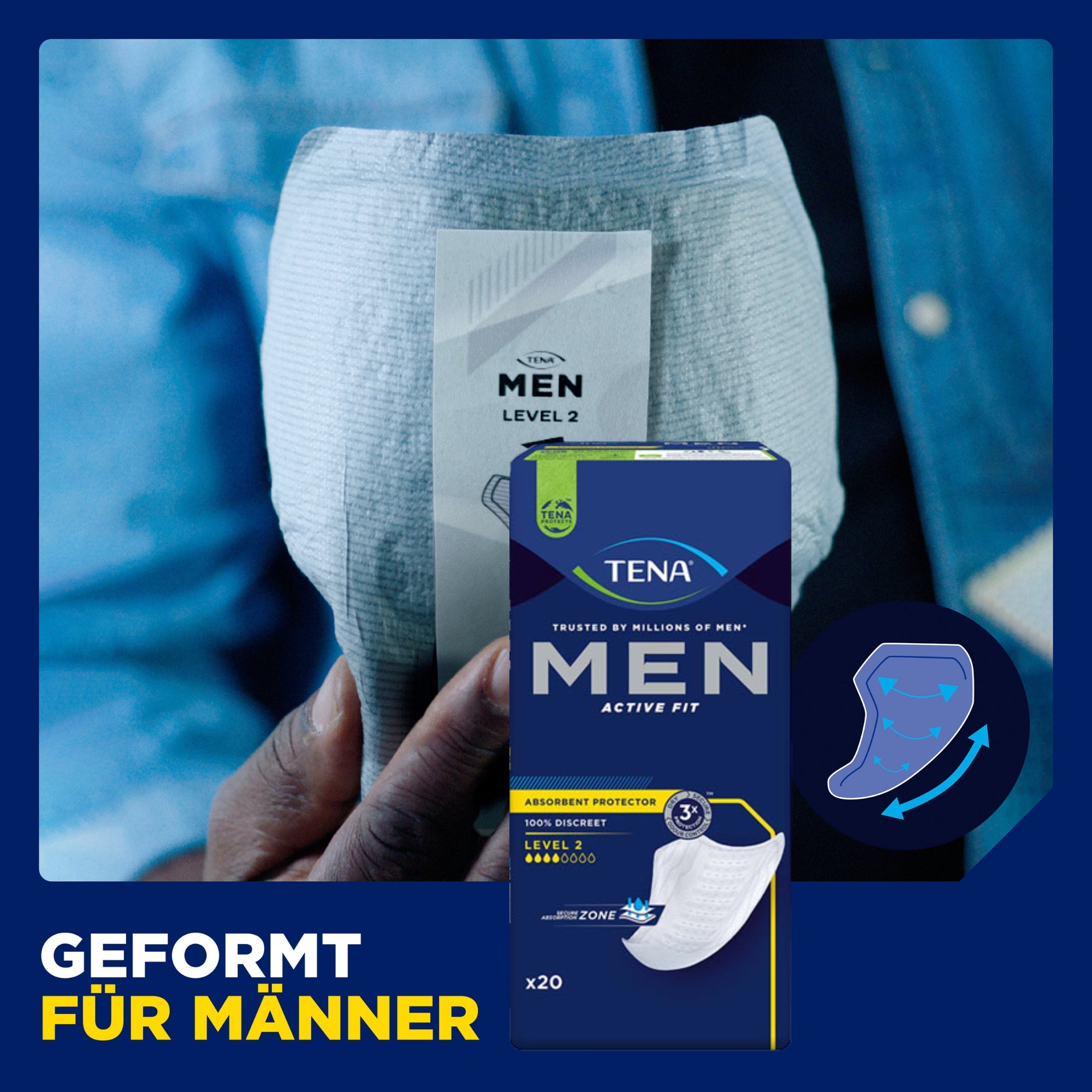 TENA Men Einlagen au fost dezvoltate special pentru anatomia masculină și oferă protecție fiabilă împotriva incontinenței în viața de zi cu zi. Inserțiile anatomice se adaptează optim, stau în siguranță și asigură un confort plăcut la purtare. Datorită formei discrete, inserțiile TENA Men sunt aproape invizibile sub haine și sunt ideale pentru bărbații activi care pun preț pe confort, siguranță și discreție.